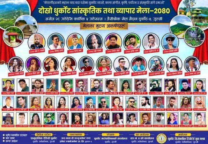 गुल्मीको धुर्कोट गाउँपालिकामा आइतबार अर्थात भोलीदेखि हुने ‘दोस्रो धुर्कोट सांस्कृतिक तथा व्यापार मेला–२०८०’ को सबै तयारी पुरा भएको छ । धुर्कोट सिर्जनशिल रिपोर्टस युवा क्लवको अयोजना, धुर्कोट गाउँपालिका वडा नम्बर ४ जैसिथोकको सह–आयोजना तथा जय माता दी एम्युजमेन्ट एण्ड इभेन्ट म्यानेजमेट प्रा.लि., बुटबलको व्यवस्थापनमा हुन गइरहेको महोत्सवको सबै तयारी पुरा भएको आयोजकले जनाएको छ । गाउँपालिकाको वडा नम्बर ४ जैसिथोक स्थित कालापोखरा खेल मैदानमा हुने कार्यक्रममा ४५ वटा स्टल रहनेछन् । कार्यक्रमको लागि आवश्यक पर्ने मञ्च व्यवस्थापन, प्रचार–प्रसार लगायतका सबै तयारी पुरा भएको क्लवका अध्यक्ष अर्जुन भण्डारीले जानकारी दिए । ‘समृद्ध धुर्कोट हाम्रो शान, कला, गला, संकृति र पर्यटन हाम्रो पहिचान’ भन्ने मुल नाराका साथ असौज २८ देखि कात्तिक ४ गतेसम्म महोत्सव संचालन हुनेछ । धुर्कोट गाउँपालिकाका पर्यटकीय स्थलहरुको प्रचार गर्दै पर्यटन प्रवद्र्धन गर्ने उदेश्यले महोत्सवको आयोजना गरिएको हो । कार्यक्रममा बोम बहादुर कार्की, विष्णु खत्री, चन्द्र शर्मा, बद्री पंगेनी, प्रकाश शपुत, पशुपति शर्मा, खुमन अधिकारी, पुष्कल शर्मा, हेमन्त शर्मा, सिम्रन परियार लगायतका कलाकारहरुको प्रस्तुती रहने क्लवले जनाएको छ । पहिलो दिनको कार्यक्रम गुल्मी क्षेत्र नम्बर २ का सासंद एवं पूर्व मन्त्री गोकर्ण विष्टले उद्घाटन गर्ने कार्यक्रम रहेको छ । कार्यक्रममा सामुदायिक रेडियो धुर्कोटले मिडिया पार्टर एवं धुर्कोट गाउँपालिकाले संरक्षकको भूमिका निर्वाह गर्ने जनाइएको छ